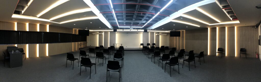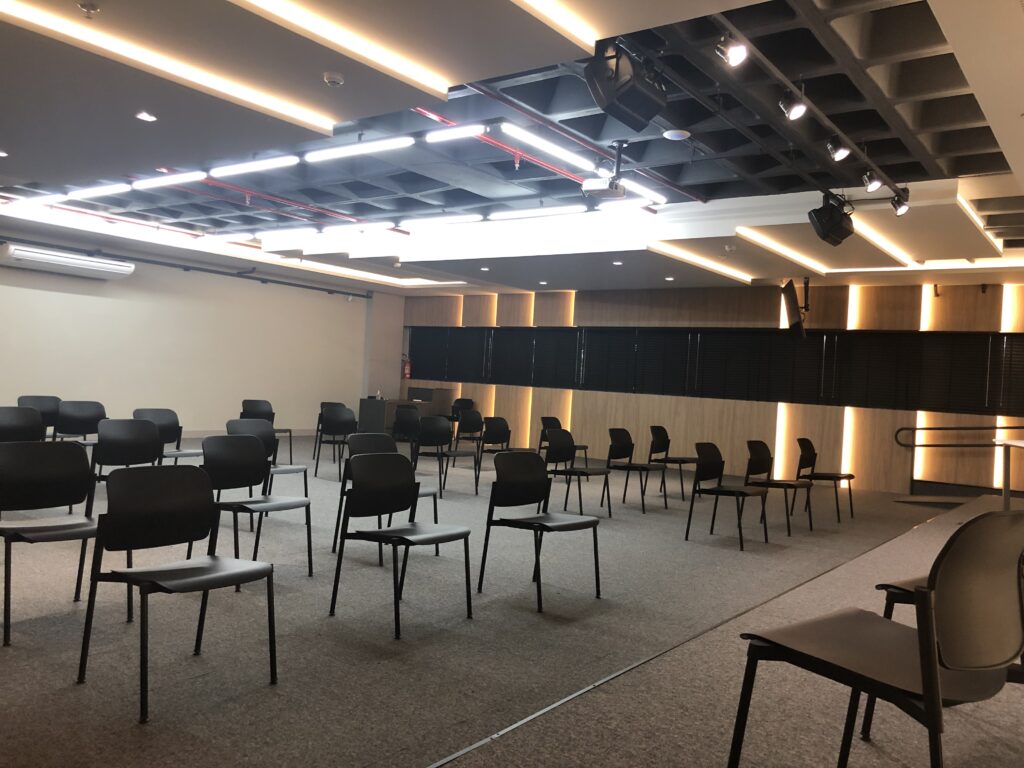 O resultado foi um auditório moderno e versátil. Dessa forma, ele atende as necessidades dos usuários de maneira eficaz. Ele está preparado para apresentações, reuniões, palestras, aulas e até sessões de meditação.