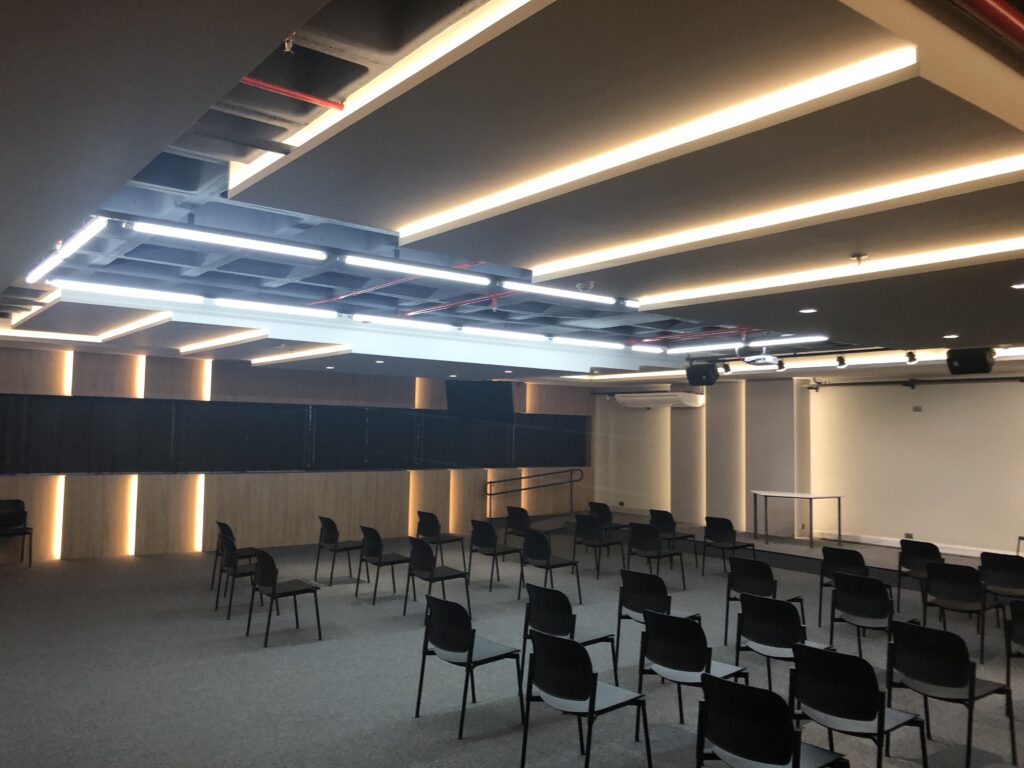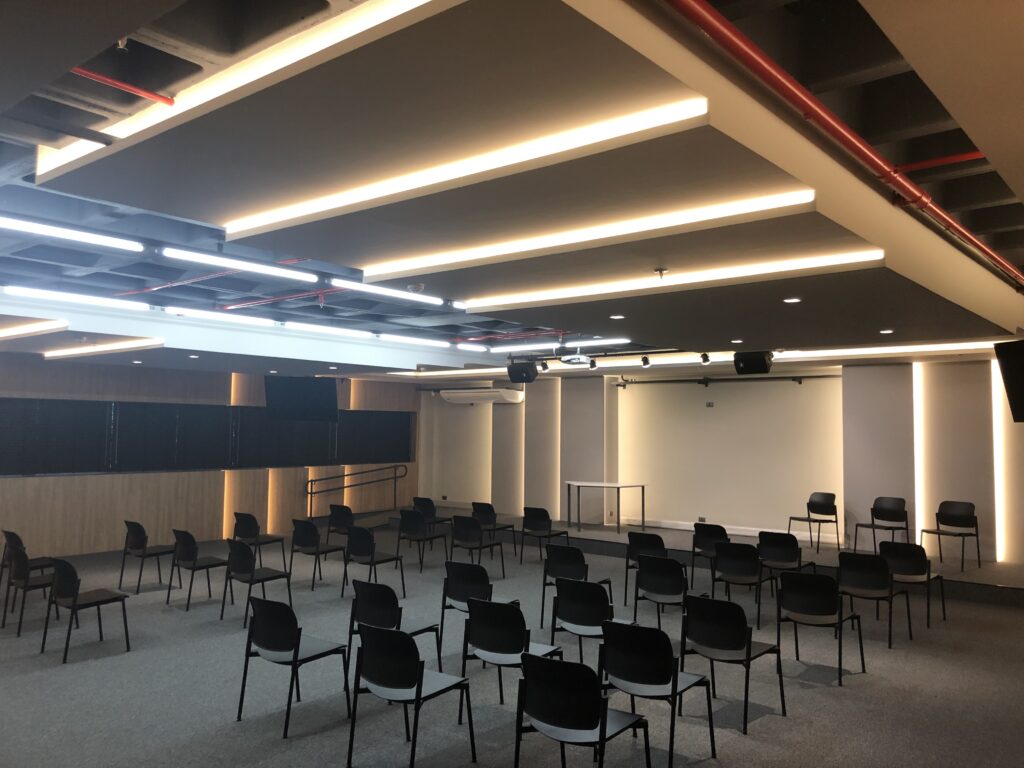 Portanto, era preciso garantir a qualidade acústica para palestras e apresentações com o melhor relação custo beneficio possível. Além disso, era necessário alinhar tudo ao design de interiores elaborado pelo renomado escritório A5 Arquitetura.