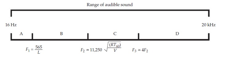 A relação entre as dimensões de uma sala determina como o espectro audível é dividido para abordagem e análise acústica. Os efeitos relacionadas a ressonâncias são mais percebidas na Região B do espectro sonoro como ilustra a imagem a seguir.