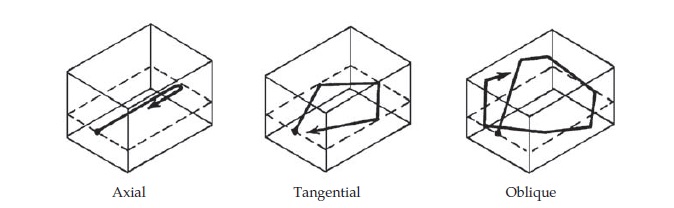 Além das axiais, também ocorrem outros tipos de ressonâncias mais fracas relacionada a reflexões entre paredes não paralelas, chamadas de tangenciais e oblíquas (reflexões entre 2 e 3 planos não paralelos) como ilustrado a seguir.
