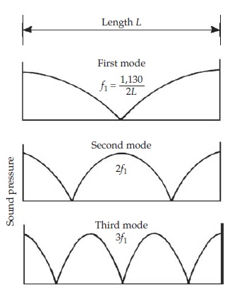 Quando uma fonte sonora emitindo um sinal acústico excita o espaço entre duas paredes, este sistema “parede-ar-parede” exibe uma frequência de ressonância relacionada com a dimensão e a velocidade do som naquele espaço. A primeira frequência de ressonância é chamada de fundamental (f1) sendo considerada uma frequência natural do espaço entre as paredes refletivas, vindo acompanhada de uma série de modos que exibem ressonâncias seguindo a série harmônica (2f1, 3f1, 4f1…) no espectro sonoro, como ilustrado na figura a seguir.